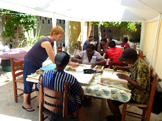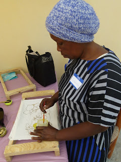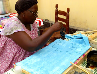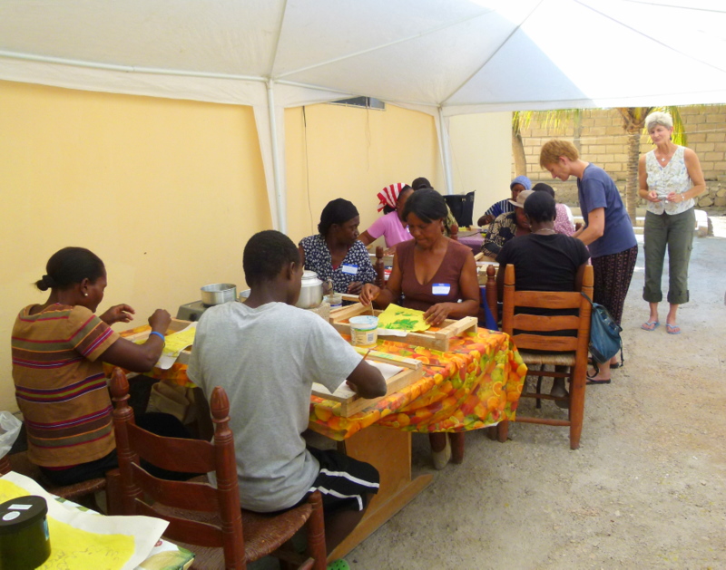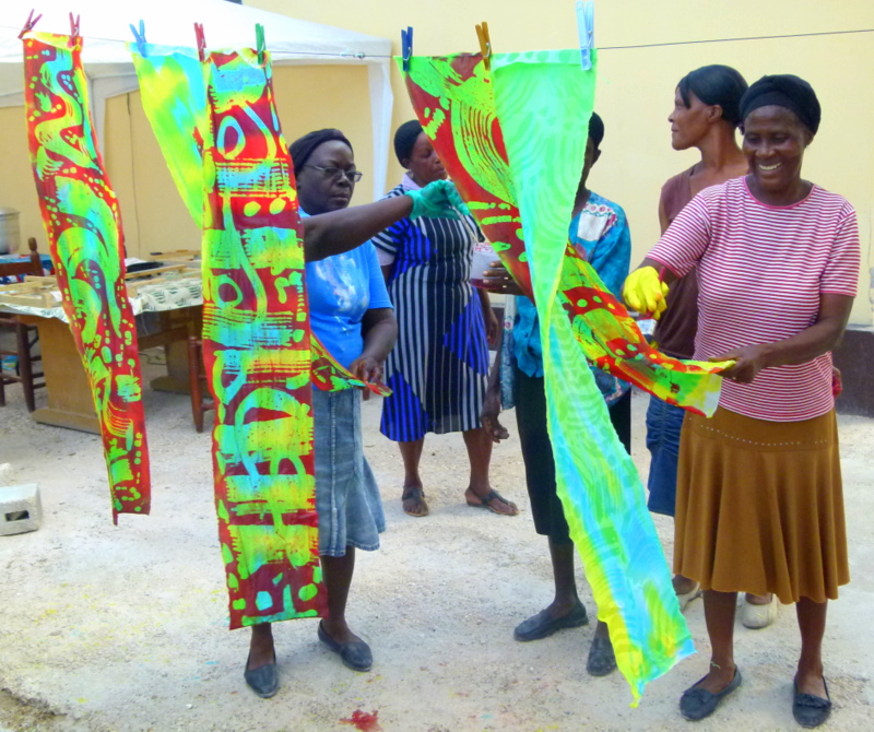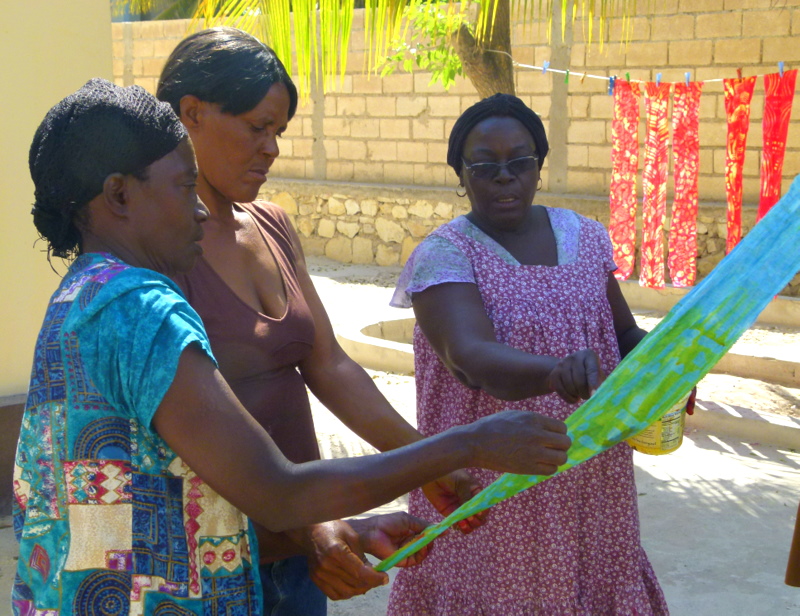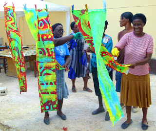 Afternoon breezes (and no rain, so far) have made for a pleasant outdoor classroom at the Episcopal Rectory compound in Gonaives. Twenty-one women (in 3 groups) are learning the batik process from artists Beth and Jonathan Evans. Jonathan's French skills are a boon! Next week a group of five (of the poorer women--who also happen to be very engaged with the work) will approach Haiti's alternative bank/micro-finance institution Fonkoze about on-going support for the project. They will be able to continue their work at the Episcopal Church compound for now, but may eventually need their own dedicated space as group size grows. Upon arrival in Port-au-Prince April 12, we toured the colorful shop of the Comite Artisanal Haitien, where Director Gisele Fleurant offered to sell products. We'll do some marketing in the US also, and hope to do online sales.