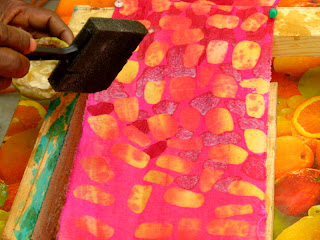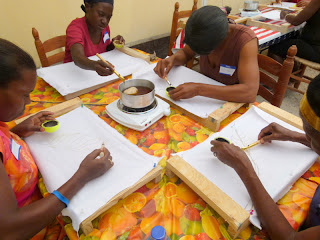 Afternoon breezes (and no rain, so far) have made for a pleasant outdoor classroom at the Episcopal Rectory compound in Gonaives. Twenty-one women (in 3 groups) are learning the batik process from artists Beth and Jonathan Evans. Jonathan's French skills are a boon! Next week a group of five (of the poorer women--who also happen to be very engaged with the work) will approach Haiti's alternative bank/micro-finance institution Fonkoze about on-going support for the project. They will be able to continue their work at the Episcopal Church compound for now, but may eventually need their own dedicated space as group size grows. Upon arrival in Port-au-Prince April 12, we toured the colorful shop of the Comite Artisanal Haitien, where Director Gisele Fleurant offered to sell products. We'll do some marketing in the US also, and hope to do online sales.